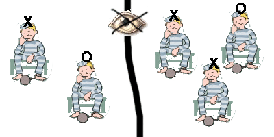 two teams cannot see each other. Each prisoner gets either an "X" or an "O" on his head